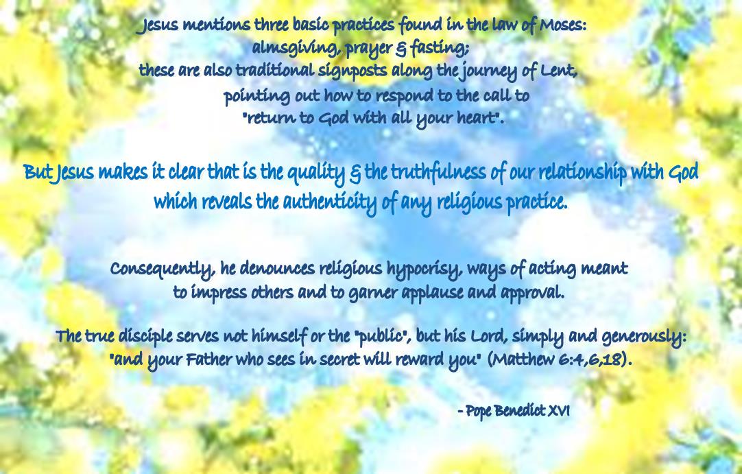 In the page of Matthew’s Gospel, which is part of the Sermon on the Mount, Jesus mentions three basic practices found in the law of Moses: almsgiving, prayer and fasting; these are also traditional signposts along the journey of Lent, pointing out how to respond to the call to "return to God with all your heart". But Jesus makes it clear that is the quality and the truthfulness of our relationship with God which reveals the authenticity of any religious practice. Consequently, he denounces religious hypocrisy, ways of acting meant to impress others and to garner applause and approval. The true disciple serves not himself or the "public", but his Lord, simply and generously: "and your Father who sees in secret will reward you" (Matthew 6:4,6,18). Our witness, then, will always be more effective the less we seek our own glory and the more we realize that the reward of the just is God himself: being one with him here below on the journey of faith, and, at life’s end, in the luminous peace of seeing him face to face for ever (cf. 1 Corinthians 13:12).