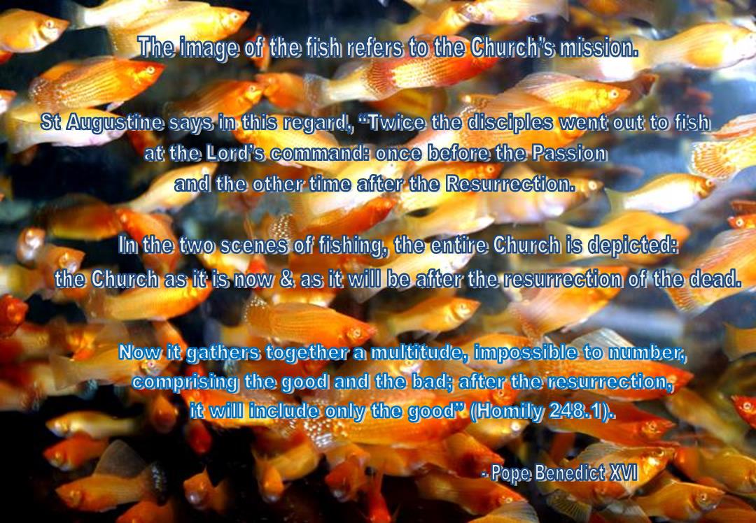 The image of the fish refers to the Church’s mission. St Augustine says in this regard, “Twice the disciples went out to fish at the Lord’s command: once before the Passion and the other time after the Resurrection. In the two scenes of fishing, the entire Church is depicted: the Church as it is now and as it will be after the resurrection of the dead. Now it gathers together a multitude, impossible to number, comprising the good and the bad; after the resurrection, it will include only the good” (Homily 248.1). The experience of Peter, certainly unique, is nonetheless representative of the call of every apostle of the Gospel, who must never be discouraged in proclaiming Christ to all men, even to the ends of the world. However, today’s text is a reflection on the vocation to the priesthood and the consecrated life. It is the work of God. The human person is not the author of his own vocation but responds to the divine call. Human weakness should not be afraid if God calls. It is necessary to have confidence in his strength, which acts in our poverty; we must rely more and more on the power of his mercy, which transforms and renews.
