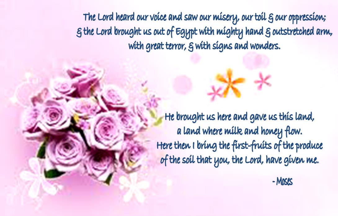 He brought us here and gave us this land, a land where milk and honey flow. Here then I bring the first-fruits of the produce of the soil that you, the Lord, have given me.”