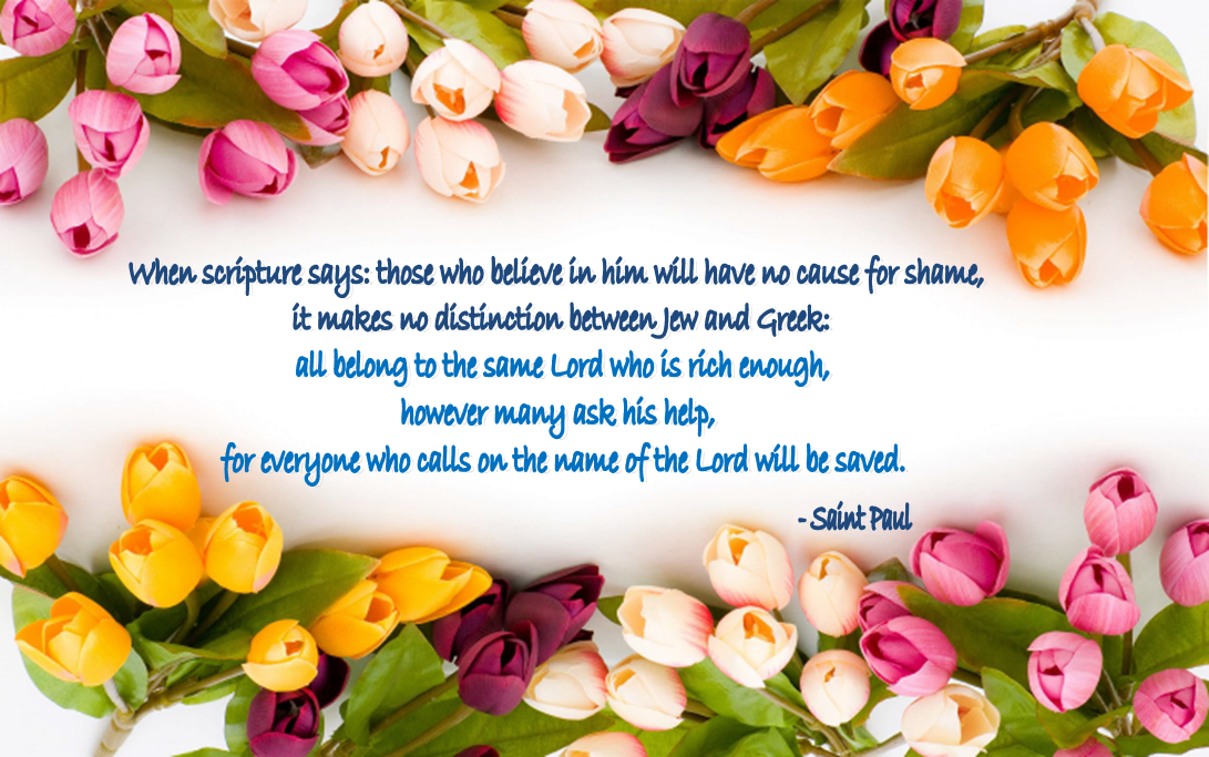 When scripture says: those who believe in him will have no cause for shame, it makes no distinction between Jew and Greek: all belong to the same Lord who is rich enough, however many ask his help, for everyone who calls on the name of the Lord will be saved. |
