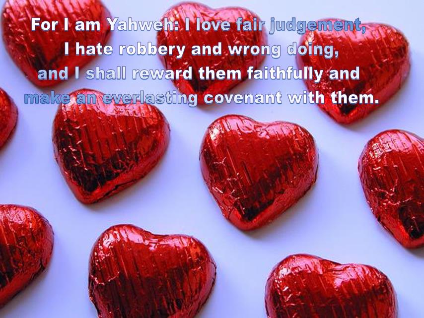 8 For I am Yahweh: I love fair judgement, I hate robbery and wrong-doing, and I shall reward them faithfully and make an everlasting covenant with them.