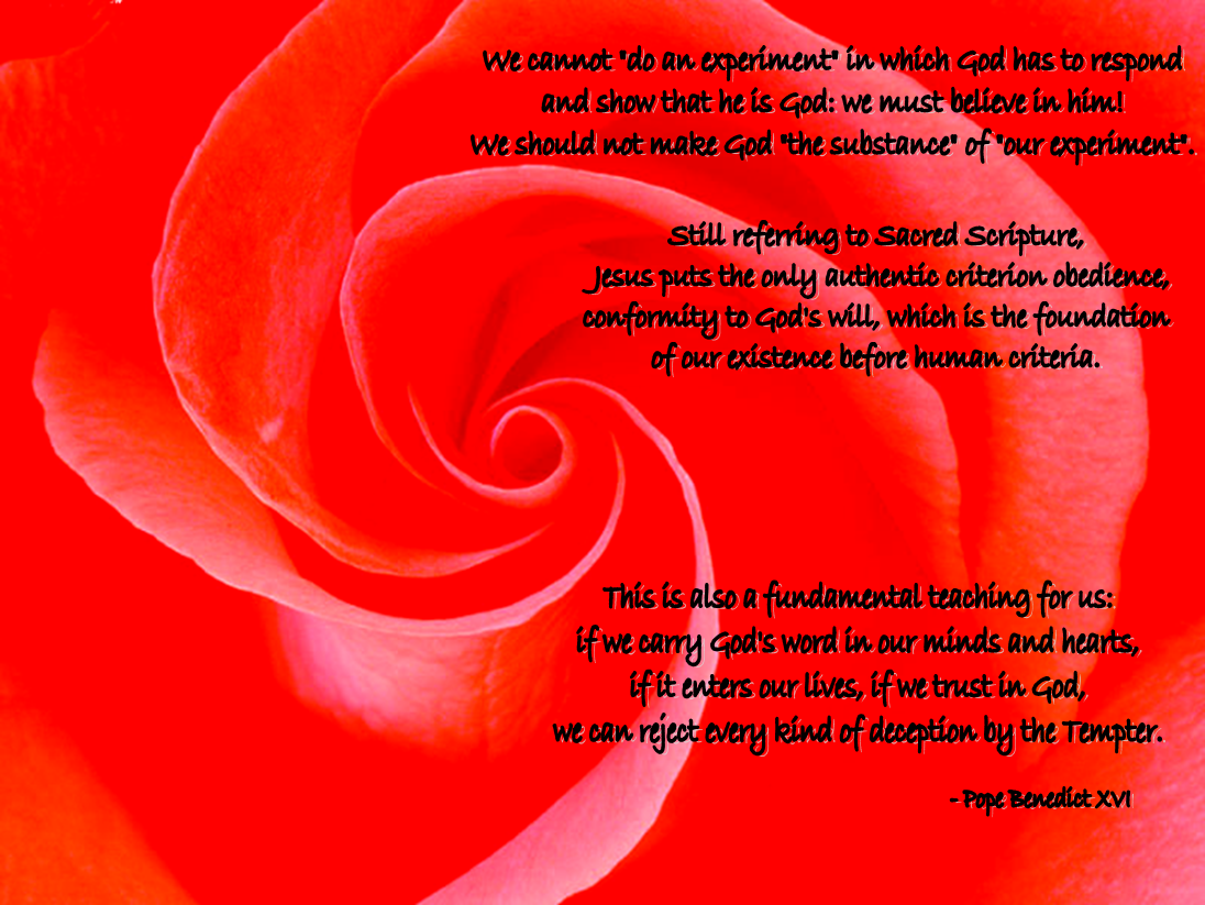 The first of the three temptations to which Satan subjects Jesus originates in hunger, that is, in material need: "If you are the Son of God command this stone to become bread". But Jesus responds with Sacred Scripture: "Man shall not live by bread alone" (Luke 4: 3-4; cf. Deuteronomy 8: 3). Then the Devil shows Jesus all the kingdoms of the earth and says: all this will be yours if, prostrating yourself, you worship me. This is the deception of power, and an attempt which Jesus was to unmask and reject: "You shall worship the Lord your God, and him only shall you serve" (cf. Luke 4: 5-8; Deuteronomy 6: 13). Not adoration of power, but only of God, of truth and love. Lastly, the Tempter suggests to Jesus that he work a spectacular miracle: that he throw himself down from the pinnacle of the Temple and let the angels save him so that everyone might believe in him. However, Jesus answers that God must never be put to the test (cf. Deuteronomy 6: 16). We cannot "do an experiment" in which God has to respond and show that he is God: we must believe in him! We should not make God "the substance" of "our experiment". Still referring to Sacred Scripture, Jesus puts the only authentic criterion obedience, conformity to God's will, which is the foundation of our existence before human criteria. This is also a fundamental teaching for us: if we carry God's word in our minds and hearts, if it enters our lives, if we trust in God, we can reject every kind of deception by the Tempter. Furthermore, Christ's image as the new Adam emerges clearly from this account. He is the Son of God, humble and obedient to the Father, unlike Adam and Eve who in the Garden of Eden succumbed to the seduction of the evil spirit, of being immortal without God.