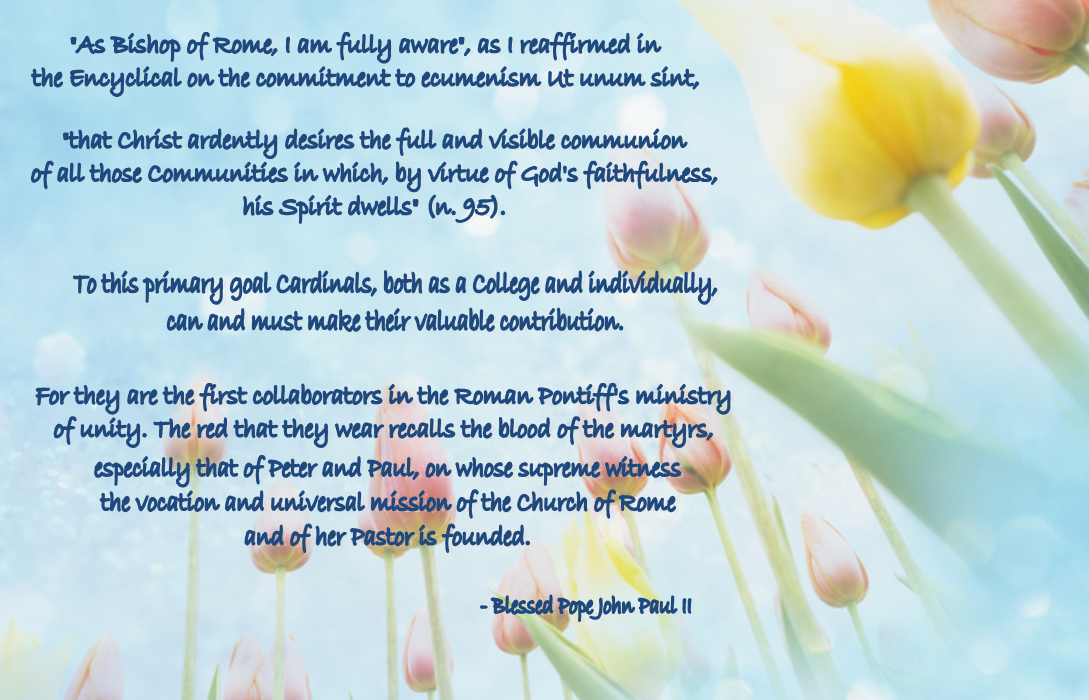 "As Bishop of Rome, I am fully aware", as I reaffirmed in the Encyclical on the commitment to ecumenism Ut unum sint, "that Christ ardently desires the full and visible communion of all those Communities in which, by virtue of God's faithfulness, his Spirit dwells" (n. 95). To this primary goal Cardinals, both as a College and individually, can and must make their valuable contribution.
