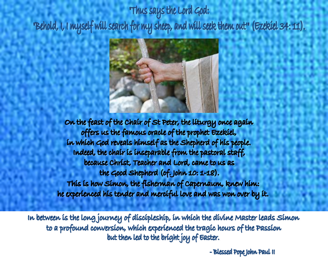 On the feast of the Chair of St Peter, the liturgy once again offers us the famous oracle of the prophet Ezekiel, in which God reveals himself as the Shepherd of his people. Indeed, the chair is inseparable from the pastoral staff, because Christ, Teacher and Lord, came to us as the Good Shepherd (cf. John 10: 1-18). This is how Simon, the fisherman of Capernaum, knew him: he experienced his tender and merciful love and was won over by it. His apostolic vocation and mission, summed up in the new name of Peter that he received from the Master, is based entirely on his relationship with him from the first meeting, to which his brother Andrew had called him (cf. John 1: 40-42), until the last one on the lake shore, when the Risen One charged him to tend his flock (cf. John 21: 15-19). In between is the long journey of discipleship, in which the divine Master leads Simon to a profound conversion, which experienced the tragic hours of the Passion but then led to the bright joy of Easter.