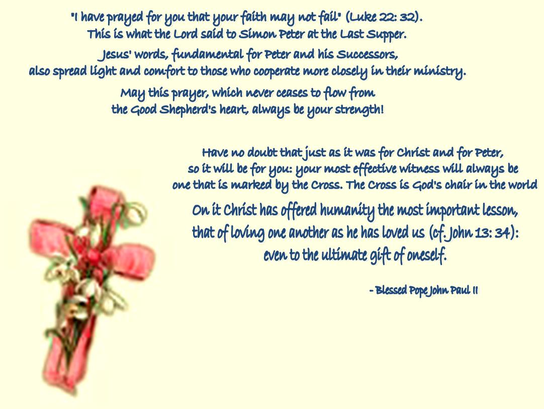 May this prayer, which never ceases to flow from the Good Shepherd's heart, always be your strength! Have no doubt that just as it was for Christ and for Peter, so it will be for you: your most effective witness will always be one that is marked by the Cross. The Cross is God's chair in the world. On it Christ has offered humanity the most important lesson, that of loving one another as he has loved us (cf. John 13: 34): even to the ultimate gift of oneself.