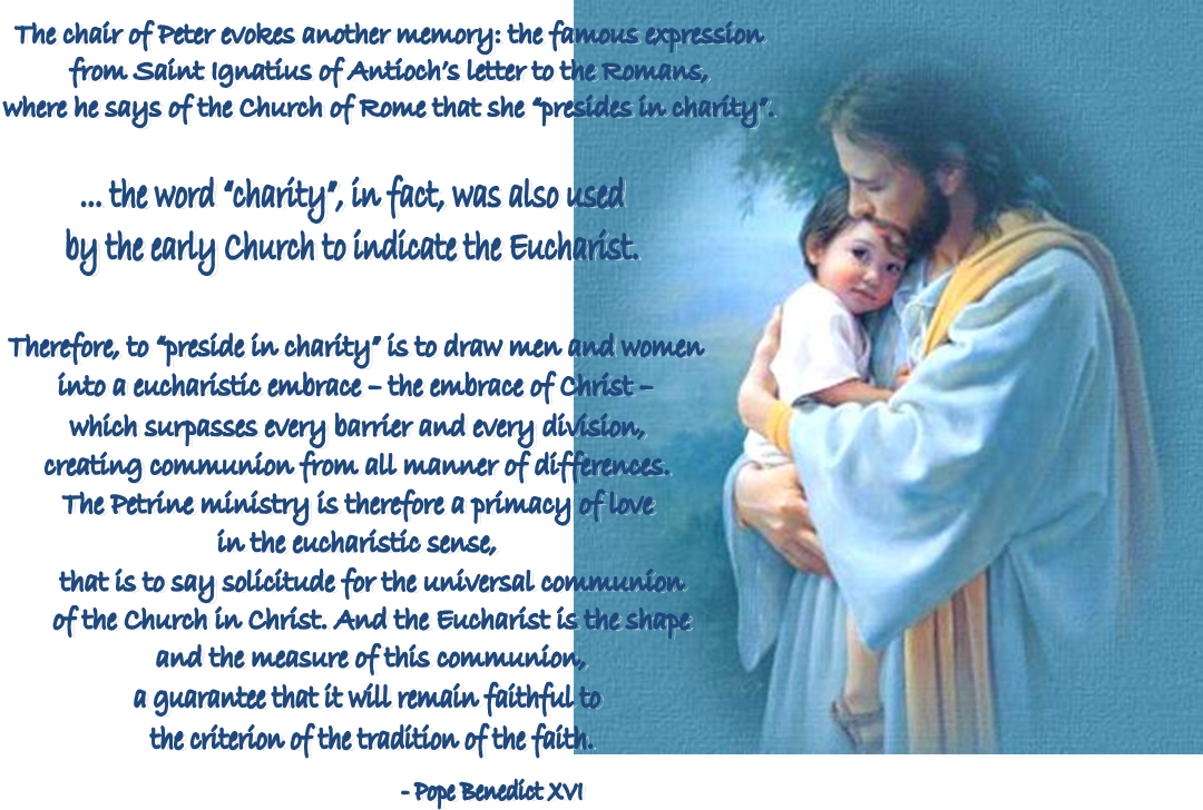 The chair of Peter evokes another memory: the famous expression from Saint Ignatius of Antioch’s letter to the Romans, where he says of the Church of Rome that she “presides in charity” (Salutation, PG 5, 801). In truth, presiding in faith is inseparably linked to presiding in love. Faith without love would no longer be an authentic Christian faith. But the words of Saint Ignatius have another much more concrete implication: the word “charity”, in fact, was also used by the early Church to indicate the Eucharist. The Eucharist is the Sacramentum caritatis Christi, through which Christ continues to draw us all to himself, as he did when raised up on the Cross (cf. John 12:32). Therefore, to “preside in charity” is to draw men and women into a eucharistic embrace – the embrace of Christ – which surpasses every barrier and every division, creating communion from all manner of differences. The Petrine ministry is therefore a primacy of love in the eucharistic sense, that is to say solicitude for the universal communion of the Church in Christ. And the Eucharist is the shape and the measure of this communion, a guarantee that it will remain faithful to the criterion of the tradition of the faith.