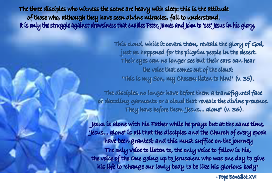 Luke does not speak of the Transfiguration but describes what happens through two elements: the Face of Jesus which changes and his clothes that become a dazzling white in the presence of Moses and Elijah, a symbol of the Law and of the Prophets. The three disciples who witness the scene are heavy with sleep: this is the attitude of those who, although they have seen divine miracles, fail to understand. It is only the struggle against drowsiness that enables Peter, James and John to "see" Jesus in his glory. Then the rhythm quickens: while Moses and Elijah take their leave of the Master, Peter speaks and as he speaks a cloud envelops him and the other disciples in its shadow. This cloud, while it covers them, reveals the glory of God, just as happened for the pilgrim people in the desert. Their eyes can no longer see but their ears can hear the voice that comes out of the cloud: "This is my Son, my Chosen; listen to him!" (v. 35).