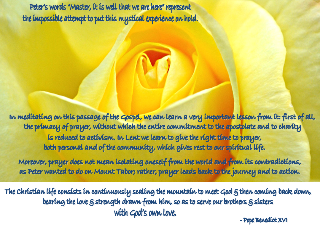 "Master, it is well that we are here" (Luke 9: 33) are Peter's ecstatic words, that often resemble our own desire before the Lord's consolations. However the Transfiguration reminds us that the joys sown by God in life are not finishing lines; rather they are lights he gives us during our earthly pilgrimage in order that "Jesus alone" may be our Law and his word the criterion that directs our existence.