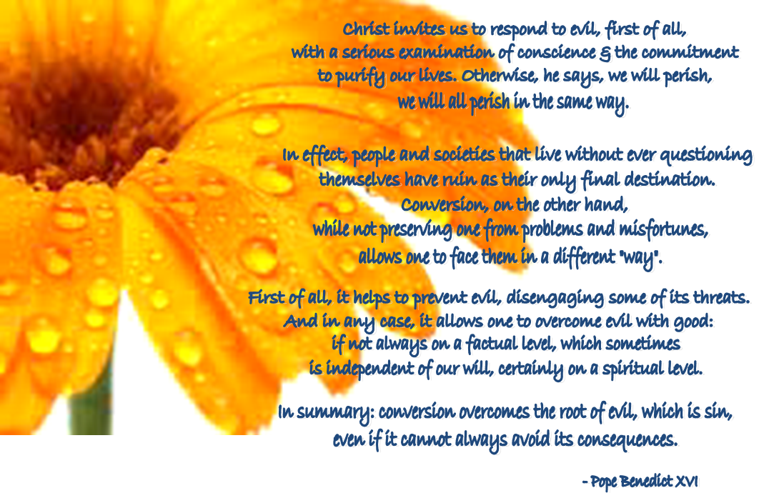 Christ invites us to respond to evil, first of all, with a serious examination of conscience and the commitment to purify our lives. Otherwise, he says, we will perish, we will all perish in the same way.