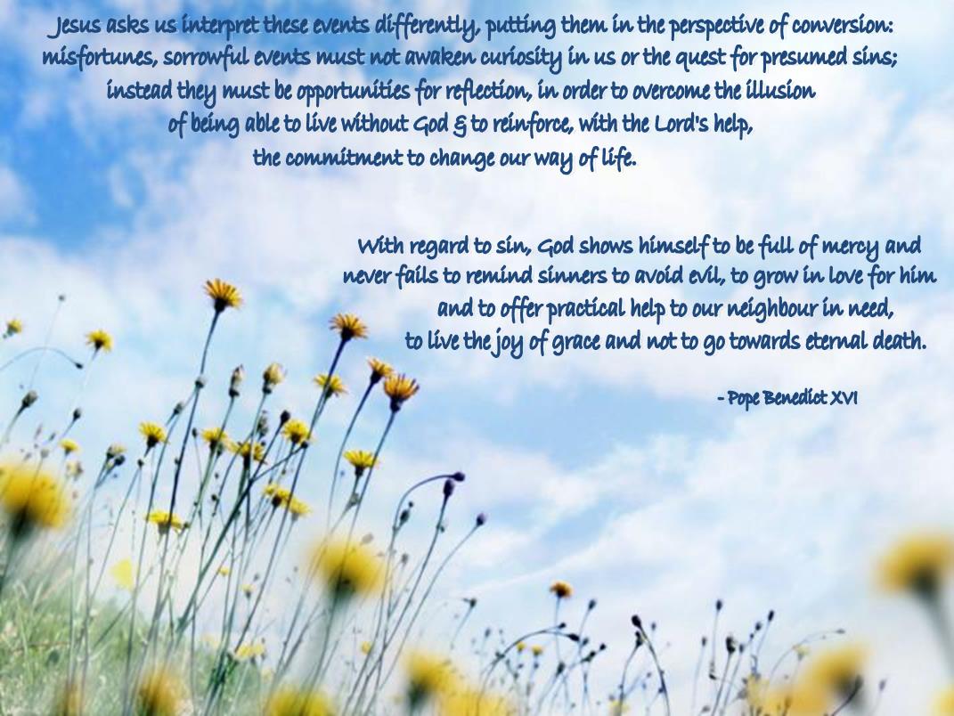 According to the mentality of the time, people were inclined to think that the disgrace which struck the victims was due to some grave fault of their own. Jesus instead says: "Do you think that these Galileans were worse sinners than all the other Galileans.... Or those eighteen upon whom the tower in Siloam fell and killed them, do you think that they were worse offenders than all the others who dwelt in Jerusalem?" (Luke 13: 2, 4). And in both cases he concludes: "I tell you, No: but unless you repent you will all likewise perish" (13: 3, 5).