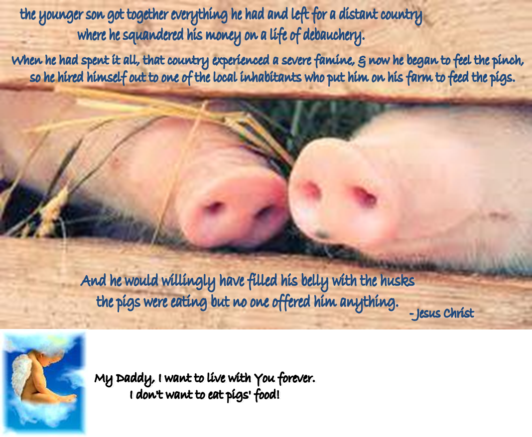 ‘When he had spent it all, that country experienced a severe famine, and now he began to feel the pinch, so he hired himself out to one of the local inhabitants who put him on his farm to feed the pigs. And he would willingly have filled his belly with the husks the pigs were eating but no one offered him anything. Then he came to his senses and said, “How many of my father’s paid servants have more food than they want, and here am I dying of hunger! I will leave this place and go to my father and say: Father, I have sinned against heaven and against you; I no longer deserve to be called your son; treat me as one of your paid servants.” So he left the place and went back to his father.