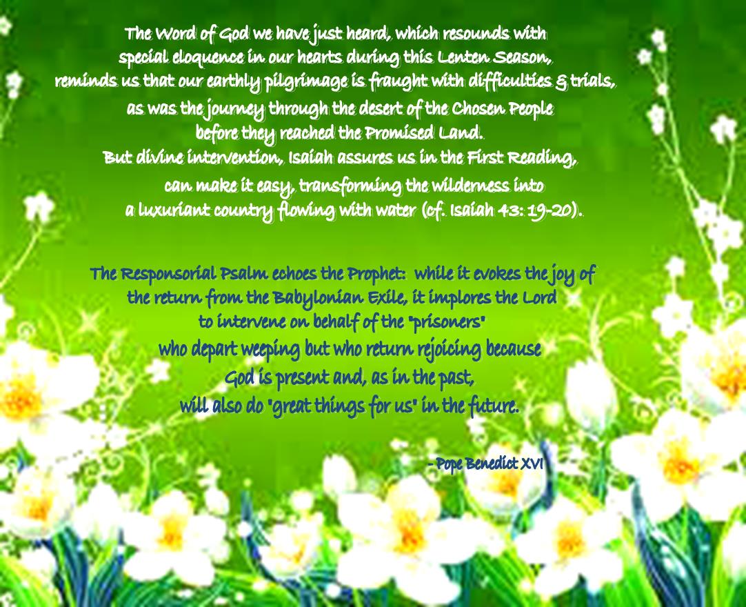 1. Today the liturgy for the Fifth Sunday of Lent offers us a passage from John’s Gospel in which Christ meets a woman caught in adultery. The Lord does not condemn her; in fact he saves her from being stoned. He does not say, “You have not sinned”, but, “Neither do I condemn you; go, and do not sin again” (cf. John 8:11). Only Christ can truly save man, because he assumes the burden of man's sin and offers him the possibility of changing.