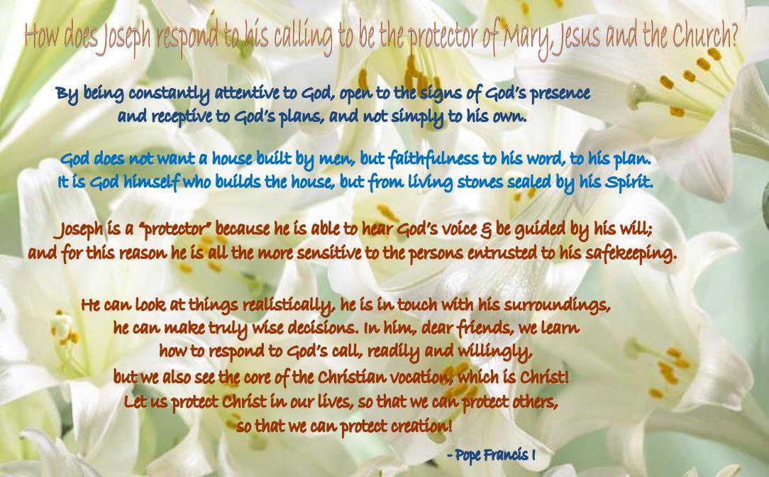 How does Joseph respond to his calling to be the protector of Mary, Jesus and the Church? By being constantly attentive to God, open to the signs of God’s presence and receptive to God’s plans, and not simply to his own. This is what God asked of David, as we heard in the first reading. God does not want a house built by men, but faithfulness to his word, to his plan. It is God himself who builds the house, but from living stones sealed by his Spirit. Joseph is a “protector” because he is able to hear God’s voice and be guided by his will; and for this reason he is all the more sensitive to the persons entrusted to his safekeeping. He can look at things realistically, he is in touch with his surroundings, he can make truly wise decisions. In him, dear friends, we learn how to respond to God’s call, readily and willingly, but we also see the core of the Christian vocation, which is Christ! Let us protect Christ in our lives, so that we can protect others, so that we can protect creation! |