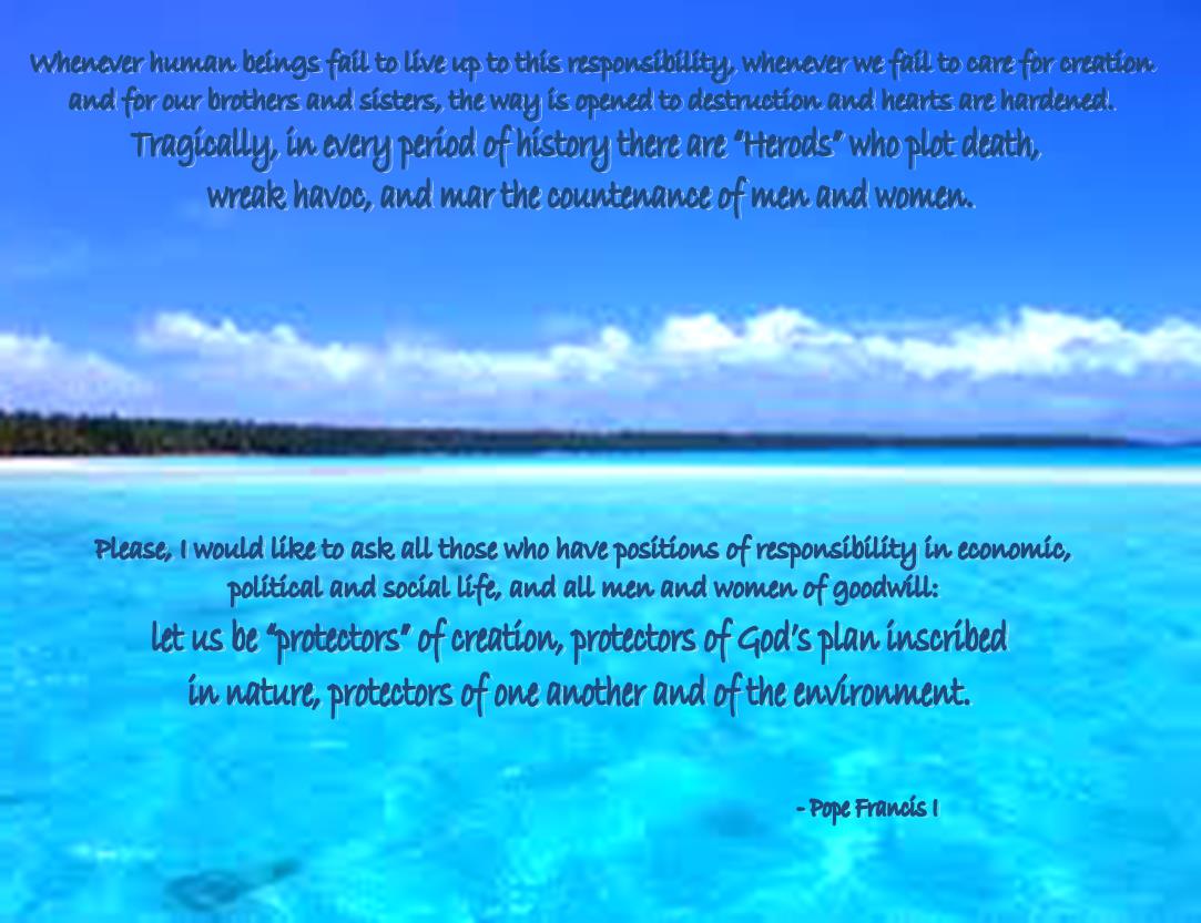 Whenever human beings fail to live up to this responsibility, whenever we fail to care for creation and for our brothers and sisters, the way is opened to destruction and hearts are hardened. Tragically, in every period of history there are “Herods” who plot death, wreak havoc, and mar the countenance of men and women.