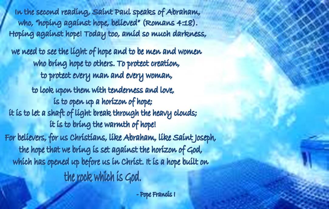 In the second reading, Saint Paul speaks of Abraham, who, “hoping against hope, believed” (Romans 4:18). Hoping against hope! Today too, amid so much darkness, we need to see the light of hope and to be men and women who bring hope to others. To protect creation, to protect every man and every woman, to look upon them with tenderness and love, is to open up a horizon of hope; it is to let a shaft of light break through the heavy clouds; it is to bring the warmth of hope! For believers, for us Christians, like Abraham, like Saint Joseph, the hope that we bring is set against the horizon of God, which has opened up before us in Christ. It is a hope built on the rock which is God.
