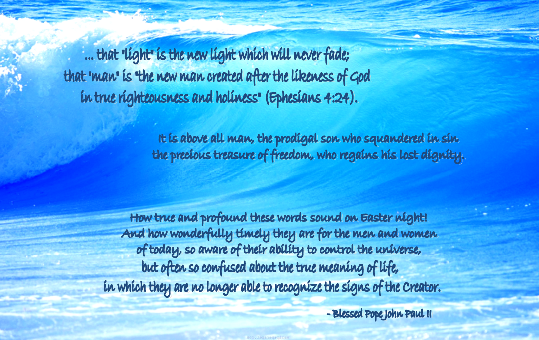 The new creation comes about at Easter. In the mystery of Christ's death and resurrection all is redeemed, and everything becomes once more perfectly good, according to God's original plan. It is above all man, the prodigal son who squandered in sin the precious treasure of freedom, who regains his lost dignity. "Faciamus hominem ad imaginem et similitudinem nostram". How true and profound these words sound on Easter night! And how wonderfully timely they are for the men and women of today, so aware of their ability to control the universe, but often so confused about the true meaning of life, in which they are no longer able to recognize the signs of the Creator.