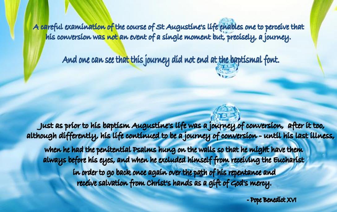 Just as prior to his baptism Augustine's life was a journey of conversion, after it too, although differently, his life continued to be a journey of conversion - until his last illness, when he had the penitential Psalms hung on the walls so that he might have them always before his eyes, and when he excluded himself from receiving the Eucharist in order to go back once again over the path of his repentance and receive salvation from Christ's hands as a gift of God's mercy.