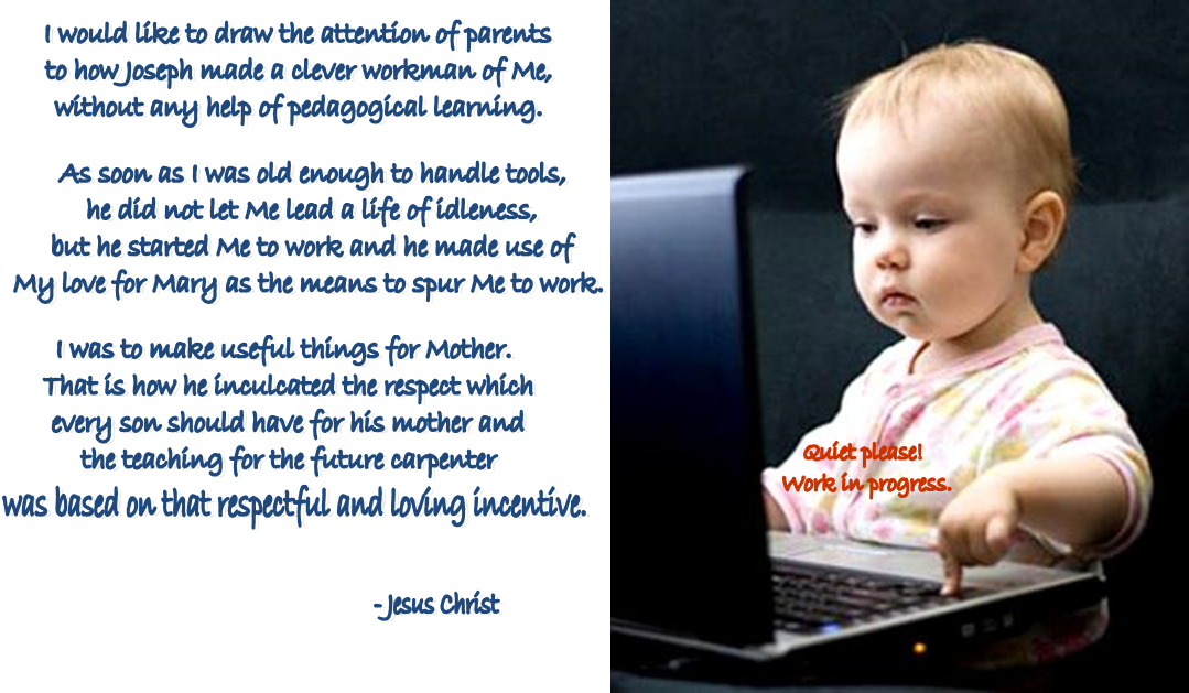 Finally I would like to draw the attention of parents to how Joseph made a clever workman of Me, without any help of pedagogical learning. As soon as I was old enough to handle tools, he did not let Me lead a life of idleness, but he started Me to work and he made use of My love for Mary as the means to spur Me to work. I was to make useful things for Mother. That is how he inculcated the respect which every son should have for his mother and the teaching for the future carpenter was based on that respectful and loving incentive.