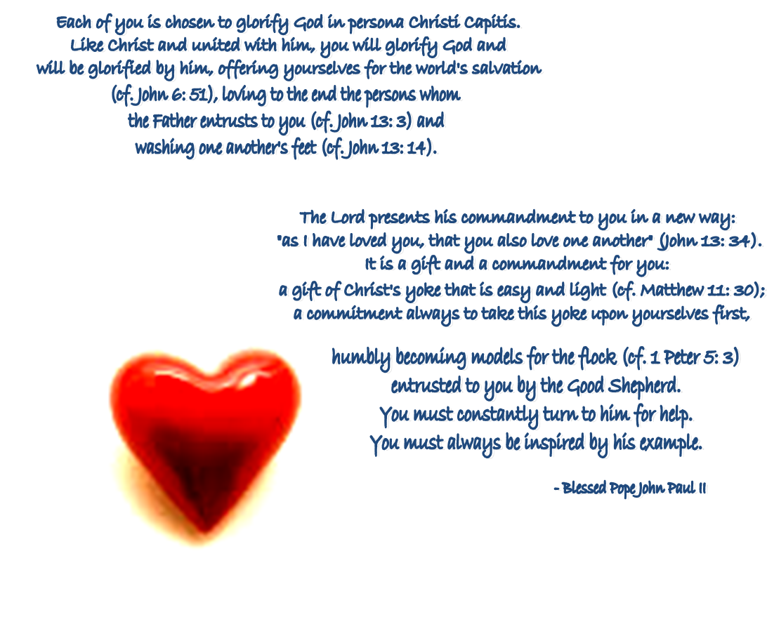 The Lord presents his commandment to you in a new way: "as I have loved you, that you also love one another" (John 13: 34). It is a gift and a commandment for you: a gift of Christ's yoke that is easy and light (cf. Matthew 11: 30); a commitment always to take this yoke upon yourselves first, humbly becoming models for the flock (cf. 1 Peter 5: 3) entrusted to you by the Good Shepherd. You must constantly turn to him for help. You must always be inspired by his example.