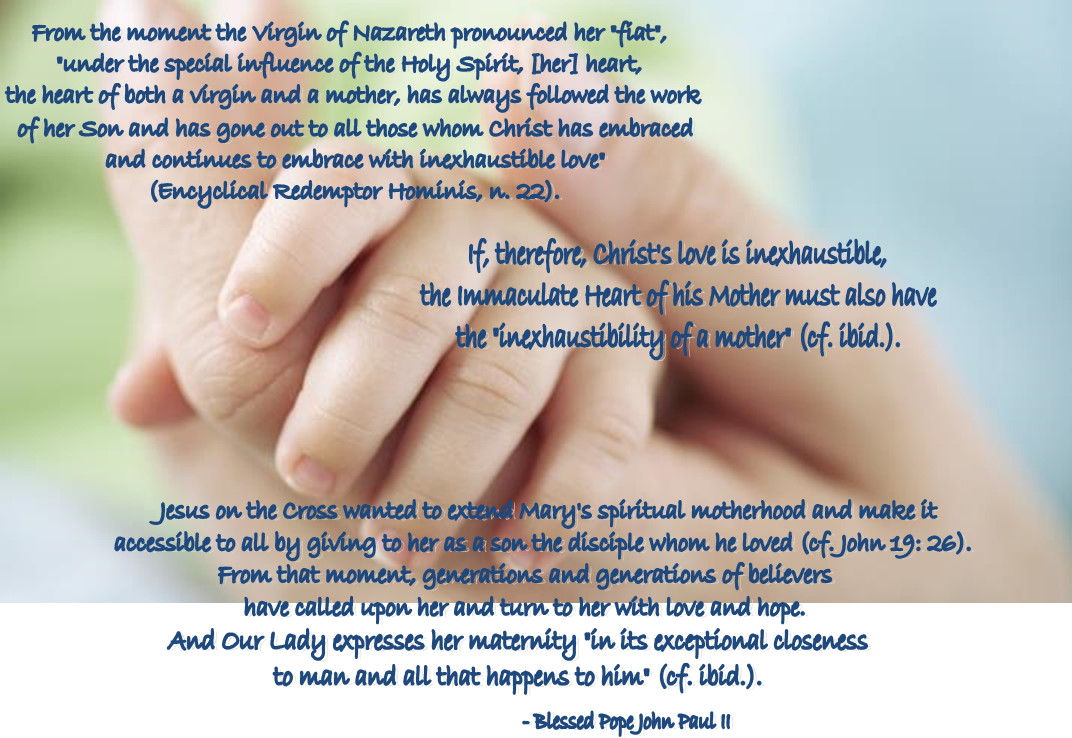 From the moment the Virgin of Nazareth pronounced her "fiat", "under the special influence of the Holy Spirit, [her] heart, the heart of both a virgin and a mother, has always followed the work of her Son and has gone out to all those whom Christ has embraced and continues to embrace with inexhaustible love" (Encyclical Redemptor Hominis, n. 22). If, therefore, Christ's love is inexhaustible, the Immaculate Heart of his Mother must also have the "inexhaustibility of a mother" (cf. ibid.).