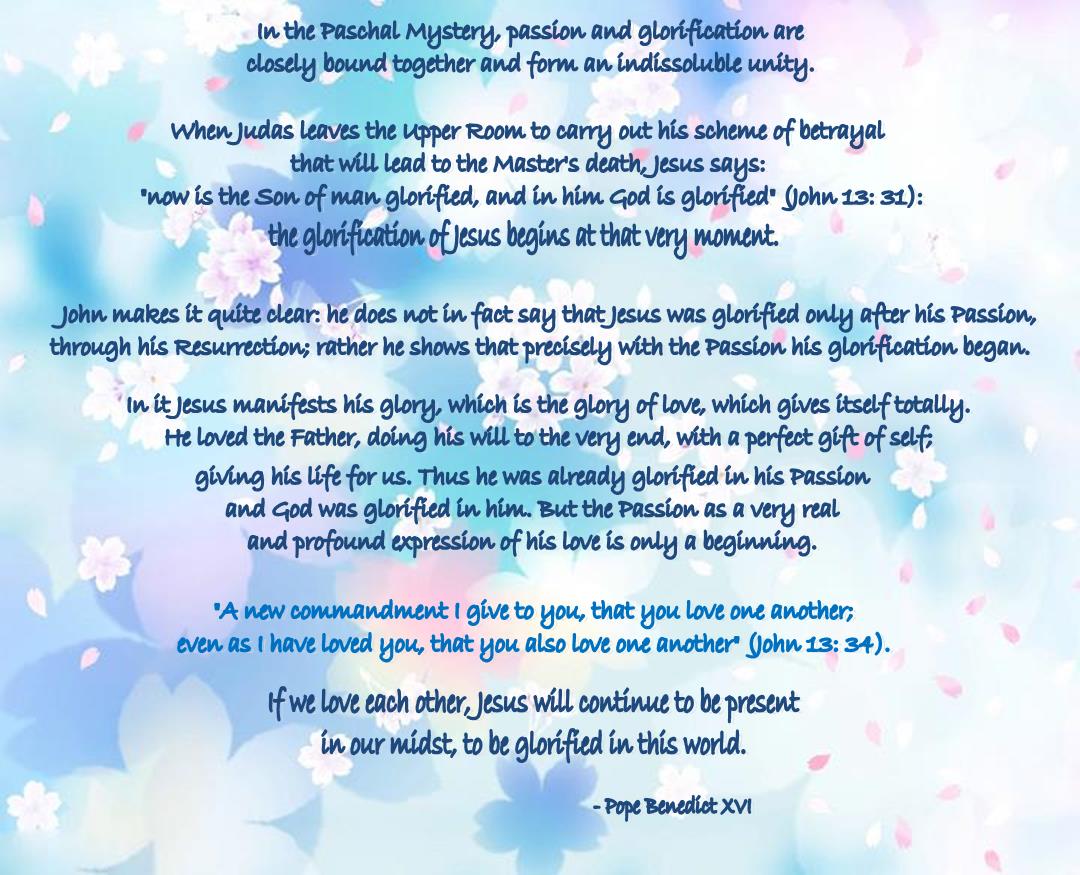 We are in the Easter Season which is the time of Jesus' glorification. The Gospel we have just heard reminds us that this glorification is brought about in the Passion. In the Paschal Mystery, passion and glorification are closely bound together and form an indissoluble unity. When Judas leaves the Upper Room to carry out his scheme of betrayal that will lead to the Master's death, Jesus says: "now is the Son of man glorified, and in him God is glorified" (John 13: 31): the glorification of Jesus begins at that very moment. The Evangelist John makes it quite clear: he does not in fact say that Jesus was glorified only after his Passion, through his Resurrection; rather he shows that precisely with the Passion his glorification began. In it Jesus manifests his glory, which is the glory of love, which gives itself totally. He loved the Father, doing his will to the very end, with a perfect gift of self; he loved humanity, giving his life for us. Thus he was already glorified in his Passion and God was glorified in him. But the Passion as a very real and profound expression of his love is only a beginning. This is why Jesus says that his glorification is also to come (cf. ibid., 13: 32). Then, when he announces his departure from this world (cf. ibid., 13: 33), the Lord gives his disciples a new commandment, as it were a testament, so that they might continue his presence among them in a new way: "A new commandment I give to you, that you love one another; even as I have loved you, that you also love one another" (John 13: 34).