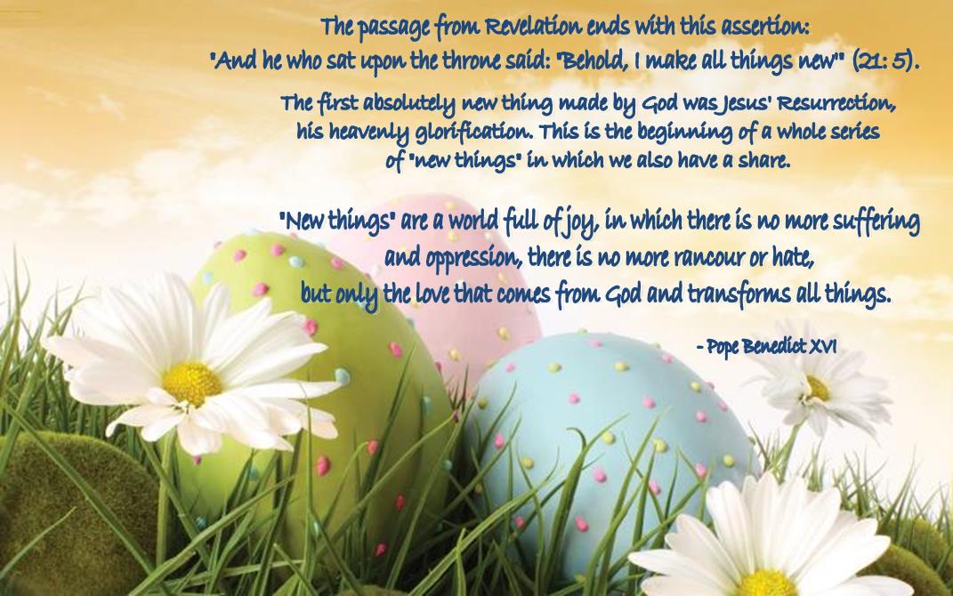 The passage from Revelation ends with this assertion: "And he who sat upon the throne said: "Behold, I make all things new'" (21: 5). The first absolutely new thing made by God was Jesus' Resurrection, his heavenly glorification. This is the beginning of a whole series of "new things" in which we also have a share. "New things" are a world full of joy, in which there is no more suffering and oppression, there is no more rancour or hate, but only the love that comes from God and transforms all things.