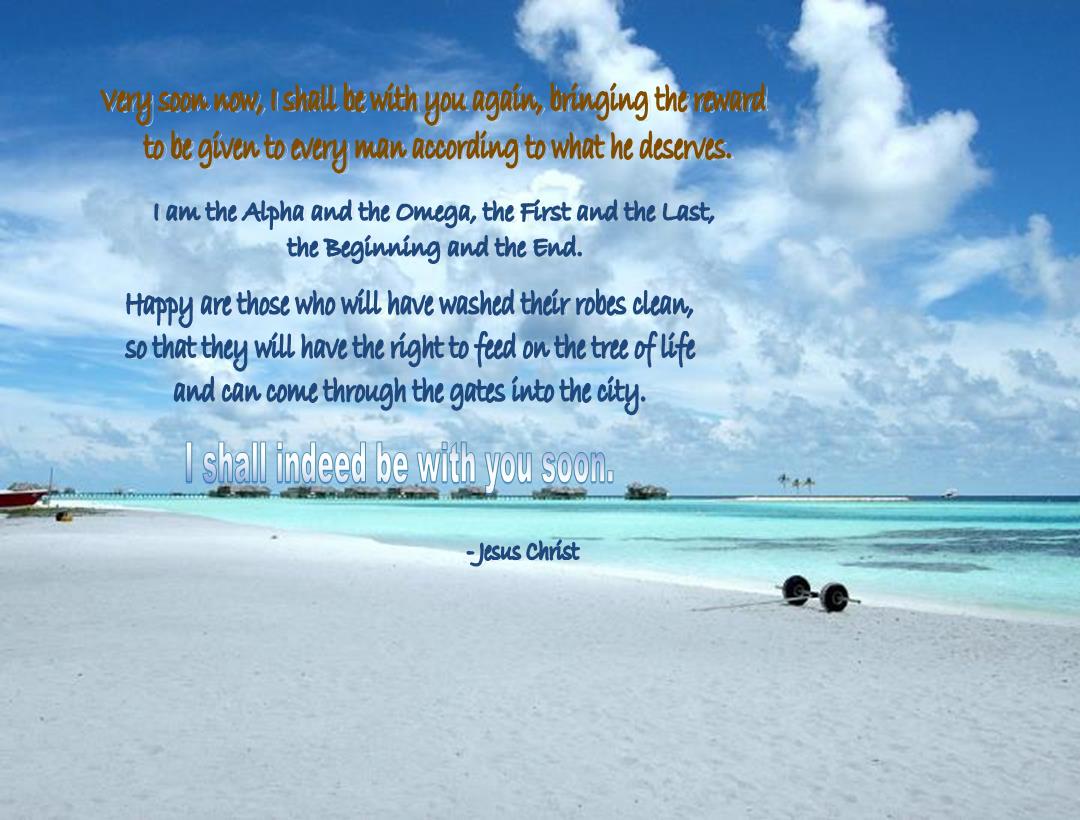 I, John, heard a voice speaking to me: ‘Very soon now, I shall be with you again, bringing the reward to be given to every man according to what he deserves. I am the Alpha and the Omega, the First and the Last, the Beginning and the End. Happy are those who will have washed their robes clean, so that they will have the right to feed on the tree of life and can come through the gates into the city.’