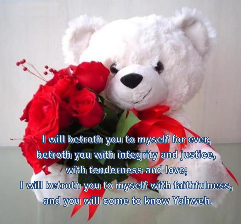 I will betroth you to myself for ever, betroth you with integrity and justice, with tenderness and love; I will betroth you to myself with faithfulness, and you will come to know Yahweh.