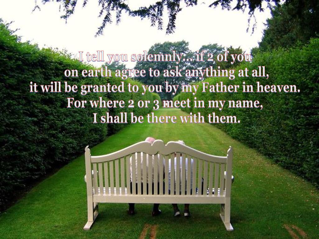 ‘I tell you solemnly once again, if two of you on earth agree to ask anything at all, it will be granted to you by my Father in heaven. For where two or three meet in my name, I shall be there with them.’