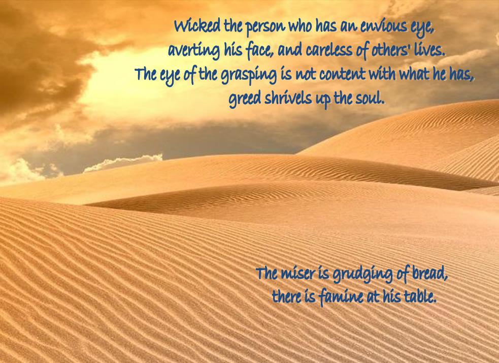 9 The eye of the grasping is not content with what he has, greed shrivels up the soul.
