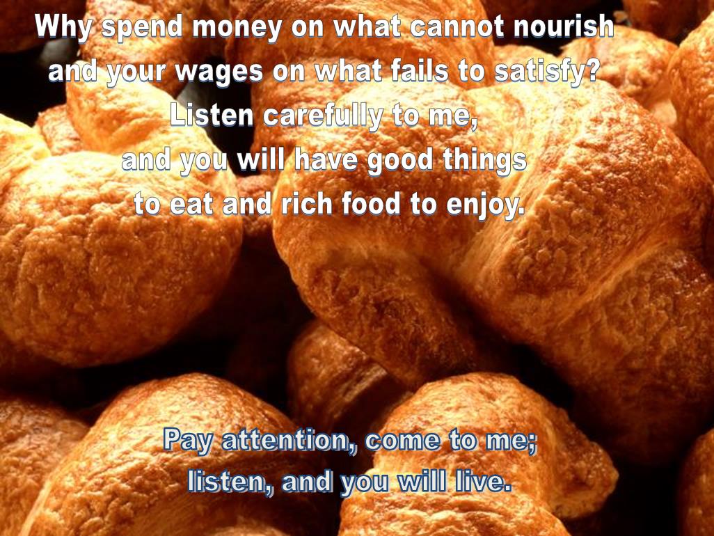 2 Why spend money on what cannot nourish and your wages on what fails to satisfy? Listen carefully to me, and you will have good things to eat and rich food to enjoy.